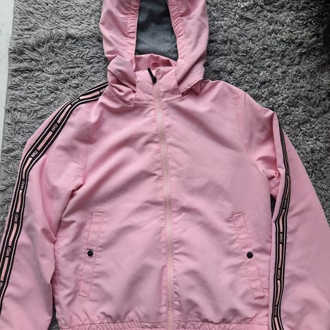 Warpin kirjava takki. Punainen irrotettava huppu ja hihat, muutoin pitkälti tummansinistä. Edessä vaalea raita. Sisäpuolella kollegekangasta. Koko 158/164.