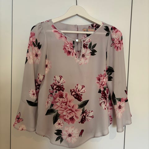 Myyntiin vähäiselle käytölle jäänyt nätti trikoinen paita, jossa on mustalla pohjalla pieniä valkoisia kukkia.