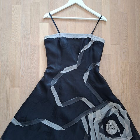 Juhlava, ihanan kevyt hihaton juhlamekko. Nuorekas malli. Yläosa pitsiä, alaosa sifongia, silkkinen alusmekko. Vyötäröllä kevyt kure. Täysin uutta vastaava kunto, kerran rippijuhlissa pidetty.