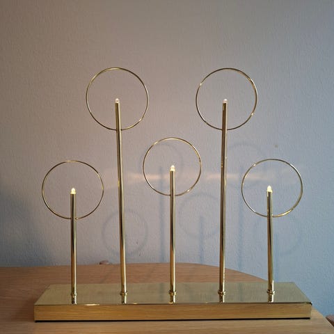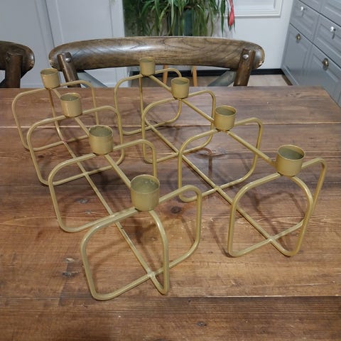 Myyn kultaisen kynttelikön, on jäänyt vähälle käytölle. Mitat 38cm pitkä, 13cm leveä. Vähän isommat kynttilät hyviä tähän. Saat liilat jos haluat, niitä on 4.