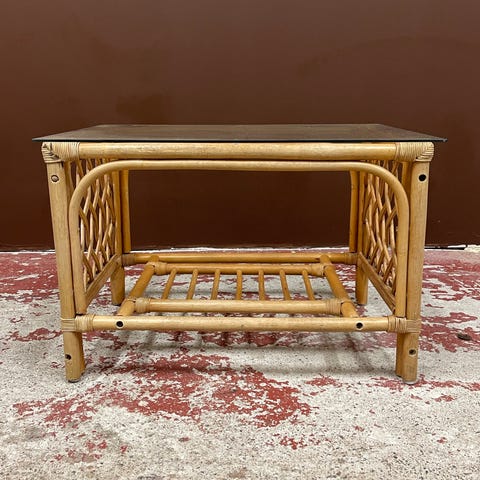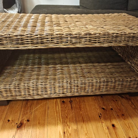 Ruskea harmaa rottinki.. Ruskea pääli levy.. Pöydän jalat 4jalkaa noin 12cm korkeat..