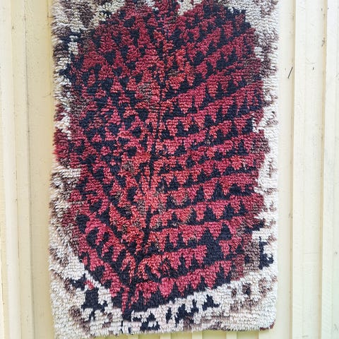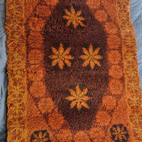 Kirsti Ilvessalon suunnittelema ja Koivusen kutomon valmistama ryijy. Hyvässä kunnossa, ei eläimiä taloudessa. 104 leveys ja 162 korkeus