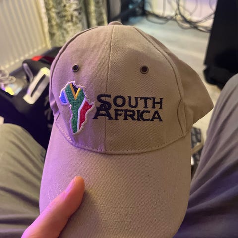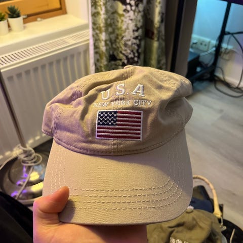 Valkoinen Kreem-lippis Paris-tekstillä. Sivussa Ranskan lippu ja takana kireyden säätö.
