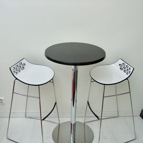 Laadukas käytännössä käyttämätön Lammhults Attach -pöytä ja 6 Lammhults Add Barstool -tuolia. Pöytälevy valkoinen melamiini ja jalat musta maalattu alumiini.