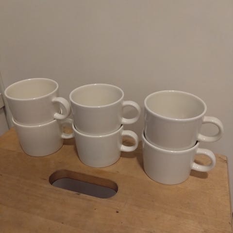 Hyväkuntoiset 2000-luvun alun tummanvihreät Iittala Arabia Teema kahvikupit. Suunnittelija tietenkin Kaj Franck. Kupin tilavuus 1,5 dl. Kupin korkeus 55 mm ja halkaisija 74 mm. Aluslautasen halkaisija 125 mm. Lautasissa vähäistä käytönjälkeä. Kupit oikein hyvässä kunnossa. Tätä vihreän sävyä ei saa enää uutena. Hinta molemmista yhteensä.