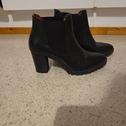 Myydään siistikuntoiset korolliset mustat Even&Odd -merkkiset ohutvuoriset nilkkurit. Nilkkureissa vetoketjut ja edessä nyöritys, jolla voi kokoa (leveyttä) vielä säätää. Korkojen takaosassa pientä kulumaa ja oikeanpuoleisen kantapään kohdalla myös pieni kuluma (näkyvät kuvassa 4), jotka saa kyllä lankilla tai nahkamaalilla poistettua. Em. kulumat huomioitu hinnassa. Kulumia ei käytännössä edes huomaa kenkien ollessa jalassa. Koko 37.