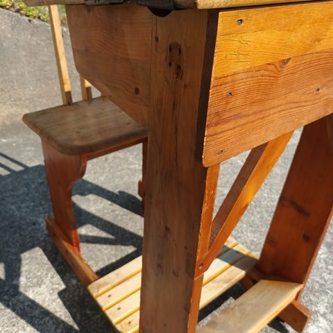 Myynnissä kauniisti patinoitunut kahden istuttava koulupulpetti. Erittäin vakaa ja jämäkkää tekoa.