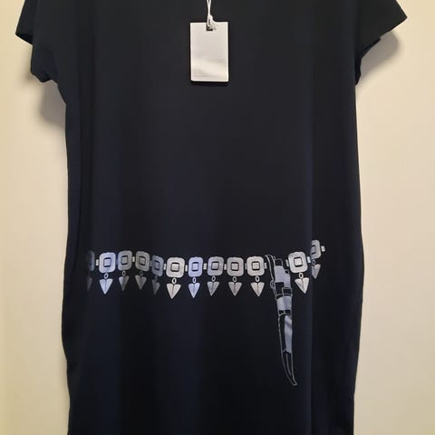 Kuvan uusi suomessa valmistettu Yes yes tunika. Väri on grafiitin harmaa ja siinä mustalla viivoitusta.