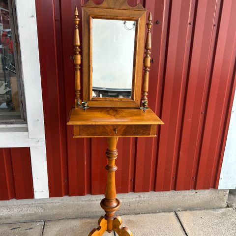 Peilipöytä kuuluu Askon mallistoon. Se on kokonaan puuta. Kalusteen leveys on 120 cm, 122 cm koristereunoista. Syvyys on 40 cm laatikosto ja 43 cm peiliosa. Korkeus: keskiosa 63 cm, sivut 70 cm ja peili lattiasta 167 cm. Peilin reuna on kauniisti hiottu . Peiliä voi hieman kääntää pystysuunnassa.