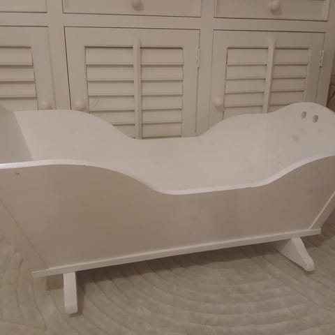 Vanha punainen puinen kehto metallipäällystetyllä jalaksilla. Maalipinta ja puun pinta hyvin rustiikkinen, mutta maali tiivis ja täysin hilseilemätön. Tukeva ja hyväkuntoinen. Pesty ihan puhtaaksi, mutta koska on vanha, niin elämän jälkeä näkyy.