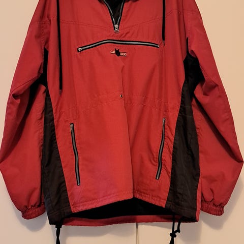 Musta anorakki.Vuoressa kauluksessa reikää.Toisen hihan suussa reikä."Kenguru pussi "edessä.Hupussa vetoketju.Hinta 5€+ lähetys.