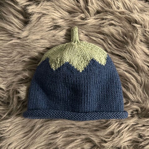 Myydään uusi käsintehty mustikkahattu, jonka materiaalina on 100 % puuvillaa.