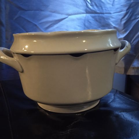 Pekka keittokulho paistivati tms., jossa kansi. Kulhon ylähalkaisija n. 26 x 19,5 cm., korkeus n. 10 cm, leveys hantaakeineen n. 32,5 cm. Kulhossa krakeloitumaa, sivulla pieni halkeama, myös jalassa pieniä viivahalkeamia. Kuvioissa kulumaa. Vanha leima : kolme A:ta ja 32, sekä massaleima FQ1H . Kunto kohtalainen, ei huono kuitenkaan, eli patinaa sopivasti.