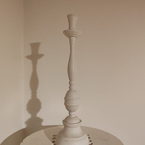 Puinen kynttilänjalka. Pieniä käytönjälkiä ja hieman mustaa palamisjälkeä yläreunassa. Nouto / kulkeutuu omien menojen mukaan. Kynttilä ei kuulu hintaan.