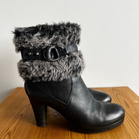 Paul Green mustat saappaat, koko 7,5, materiaali nahka. Vuori aitoa turkista (lammas), saumoissa tikkaukset. Koristeena solkia.