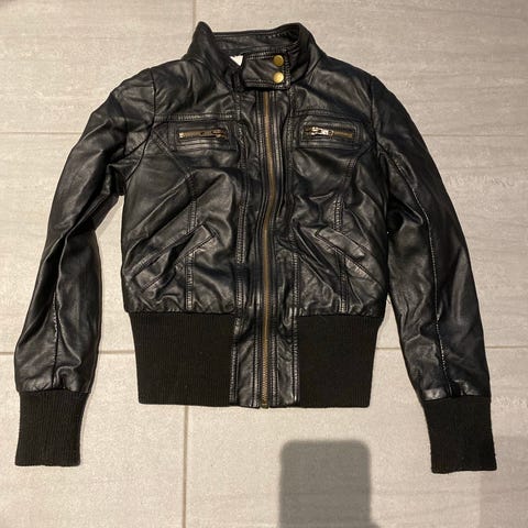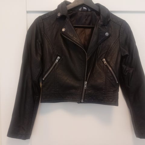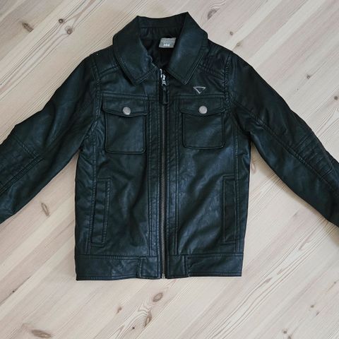 H&M tekonahkainen musta hupullinen takki 146 cm, huppu irrotettavissa, kiinnistys tarroilla