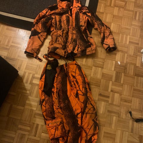 Takki ja housut kokoa XXL. Takissa irrotettava fleecevuori/takki ja housuissa olkaimet.