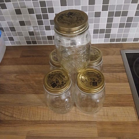 Myydään yhteishinnalla 9 kpl keltakantisia lasipurkkeja, sopii hyvin esim. mausteiden säilyttämiseen. Korkeus 11,5 cm, leveys 8 cm ja syvyys 8 cm.
