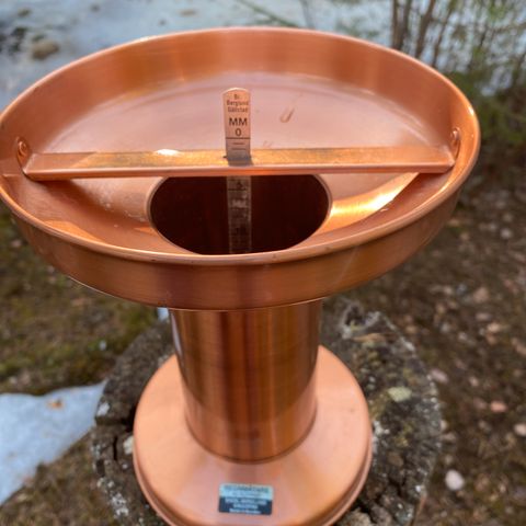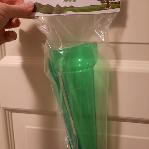 Ostetaan sademittari lasi/muovi osa, oma on mennyt rikki. Voi olla myös ilman mitta asteikkoa (piirrän itse). Tärkeintä että on saman muotoinen ja kokoinen kuin kuvassa, joku läpinäkyvä astia, pieni maljakko tai vaikka koeputki. Halkaisija alaosa 2,5 cm, yläosa 3 cm, pituus 14 cm.