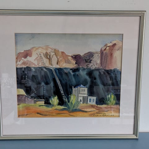 Sylvi Hentilän akvarellityö Myrsky luodolla vuodelta 2001. Työn korkeus on 29 cm ja leveys 39 cm.