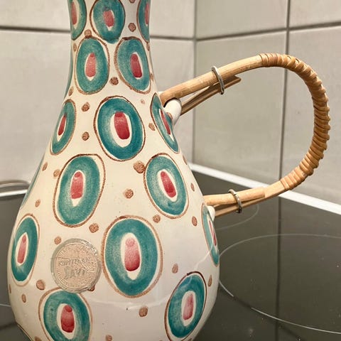 Kupittaan Saven kaksi kannua. Korkeus on 13 cm ja leveys 10 cm.