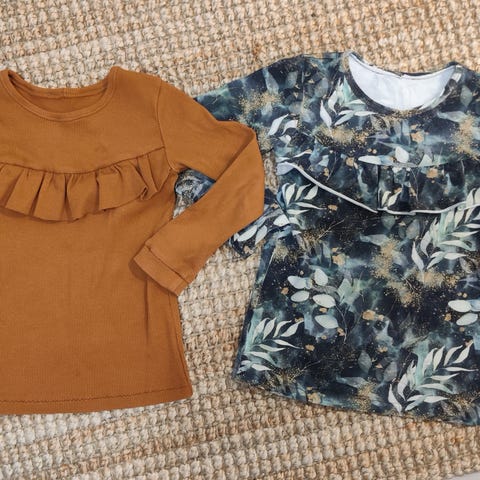 Myydään hyväkuntoinen, ompelijan tekemä röyhelötoppi sekä kotimaisesta metsolan kankaasta tehty hame. Molemmat ovat kokoa 104.