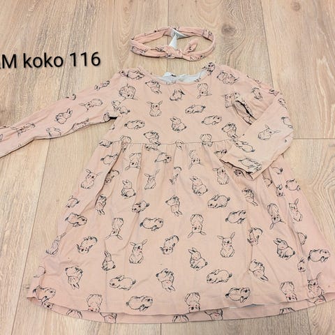 Myydään ompelijan Nosh kankaasta ompelemat frillamekko ja hiuspompula sekä pupunkorva leggarit. Vaatteet hyväkuntoisia (kokoa 116 cm).