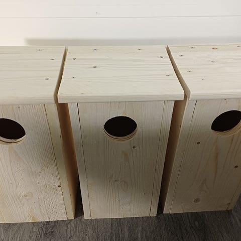 Myynnissä erilaisia ja laadukkaita itsetehtyjä linnunpönttöjä.