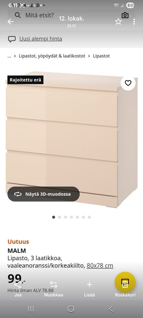 Antiikki ja taide (62 797)Auto-, vene- ja moottoripyörätarvikkeet (235 440)Elektroniikka ja kodinkoneet (138 174)Eläimet ja eläintarvikkeet (33 746)Koti ja sisustus (508 531)Lapset ja vanhemmat (424 627)Liiketoiminta ja palvelut (35 606)Piha ja remontointi (115 376)Urheilu ja ulkoilu (147 940)Vaatteet, kosmetiikka ja asusteet (574 007)Viihde ja harrastukset (369 863)