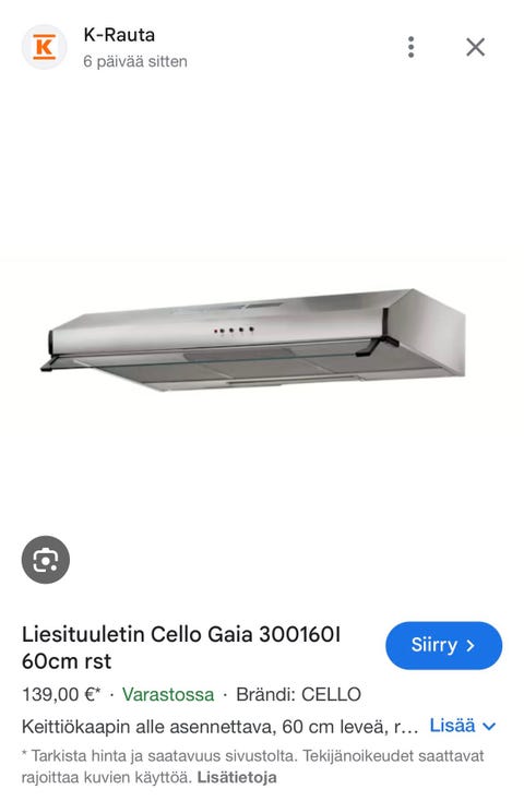 110 €Cello Gaia 300160I Liesituuletin 60 cm sekä aktiivihiilisuodatinPori, Pori Keskus, Satakunta6 minLisää suosikiksi.