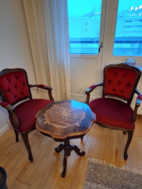 150 €Antiikkityylinen puinen pöytä ja kaksi verhoiltua tuoliaJyväskylä, Jyskä, Keski-Suomi6 pvLisää suosikiksi.