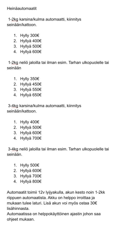 Akvaariot (27)Eläinten ruokinta, hoito, jalostus ja tallipaikat (28)Hevoset (14)Hevostarvikkeet ja ratsastustarvikkeet (366)Hyönteiset ja hämähäkit (1)Häkit (37)Jyrsijät ja kanit (27)Kalat (9)Karja (4)Kissat (5)Kissatarvikkeet (42)Koirat (1)Koiratarvikkeet (259)Linnut (9)Matelijat (3)Muut eläimet (9)Muut eläintarvikkeet (43)