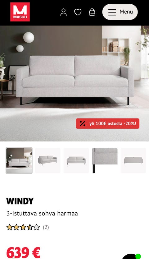 2 istuttava sohva