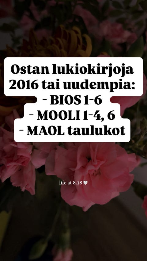 OstetaanOstetaan lukion biologian ja kemian kirjat sekä MAOL taulukotKajaani, Lehtikangas, Kainuu1 pvLisää suosikiksi.