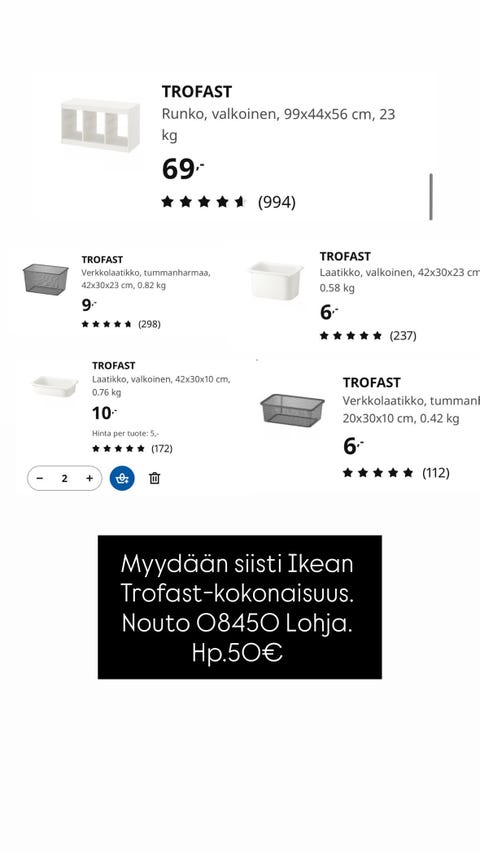 Antiikki ja taide (280)Auto-, vene- ja moottoripyörätarvikkeet (18)Elektroniikka ja kodinkoneet (32)Eläimet ja eläintarvikkeet (16)Koti ja sisustus (4 873)Lapset ja vanhemmat (117)Liiketoiminta ja palvelut (19)Piha ja remontointi (28)Urheilu ja ulkoilu (18)Vaatteet, kosmetiikka ja asusteet (58)Viihde ja harrastukset (66)