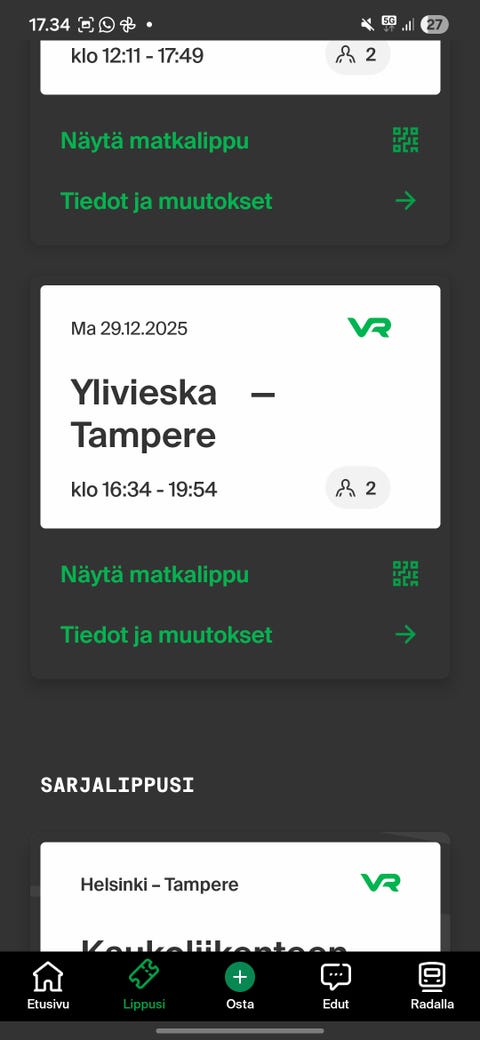 30 €Ma 29.12. Ylivieska - Tampere 1 aikuinen ja 1 opiskelijaYlivieska, Ylivieska Keskus, Pohjois-Pohjanmaa4 tLisää suosikiksi.