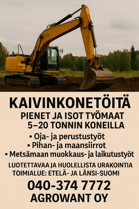45 €KAIVINKONEURAKOINTIA – 5 tn, 13 tn ja 20 tn kaivinkoneilla – Etelä & Länsi-SuomiHuittinen, Huittinen Keskus, Satakunta9 minAgrowant OyLisää suosikiksi.