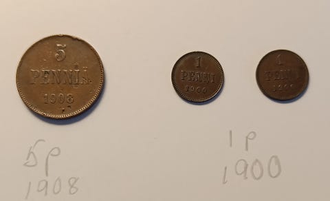 10 €5 pennin kolikko 1908 ja kaksi1 pennin kolikkoa 1900Kuopio, Inkilänmäki, Pohjois-Savo20 tLisää suosikiksi.