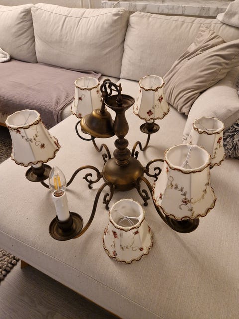 40 €Messinkikruunu, jossa on kankaiset, kukkakuvioiset lampunvarjostimet.Kontiolahti, Kontioranta-Kontioniemi, Pohjois-Karjala28.1.Lisää suosikiksi.