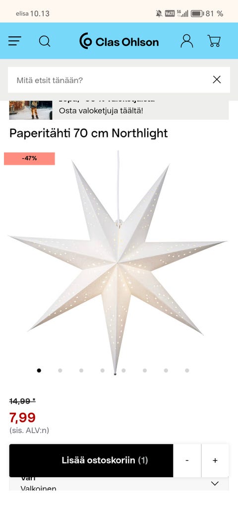 Antiikki ja taide (8 298)Auto-, vene- ja moottoripyörätarvikkeet (20 513)Elektroniikka ja kodinkoneet (14 830)Eläimet ja eläintarvikkeet (3 909)Koti ja sisustus (55 117)Lapset ja vanhemmat (49 919)Liiketoiminta ja palvelut (4 298)Piha ja remontointi (12 965)Urheilu ja ulkoilu (16 306)Vaatteet, kosmetiikka ja asusteet (64 442)Viihde ja harrastukset (38 622)