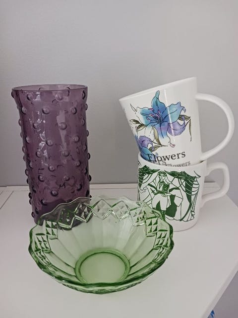 Maljakko, lasikulho ja mukit