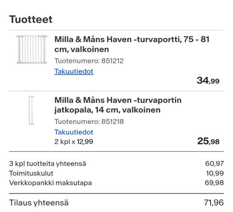 Antiikki ja taide (23 348)Auto-, vene- ja moottoripyörätarvikkeet (50 095)Elektroniikka ja kodinkoneet (52 349)Eläimet ja eläintarvikkeet (9 452)Koti ja sisustus (195 374)Lapset ja vanhemmat (162 151)Liiketoiminta ja palvelut (9 925)Piha ja remontointi (29 392)Urheilu ja ulkoilu (65 087)Vaatteet, kosmetiikka ja asusteet (224 552)Viihde ja harrastukset (140 893)