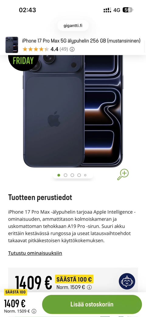 1 149 €iPhone 17 Pro 256GB Mustansininen, 12KK TAKUU 256 GB AppleHelsinki, Myllypuro, Uusimaa14 tRecell - KauppaLisää suosikiksi.