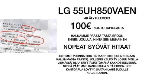 Antiikki ja taide (23 830)Auto-, vene- ja moottoripyörätarvikkeet (51 369)Elektroniikka ja kodinkoneet (52 341)Eläimet ja eläintarvikkeet (9 764)Koti ja sisustus (198 897)Lapset ja vanhemmat (164 251)Liiketoiminta ja palvelut (9 887)Piha ja remontointi (30 558)Urheilu ja ulkoilu (61 917)Vaatteet, kosmetiikka ja asusteet (228 111)Viihde ja harrastukset (141 388)