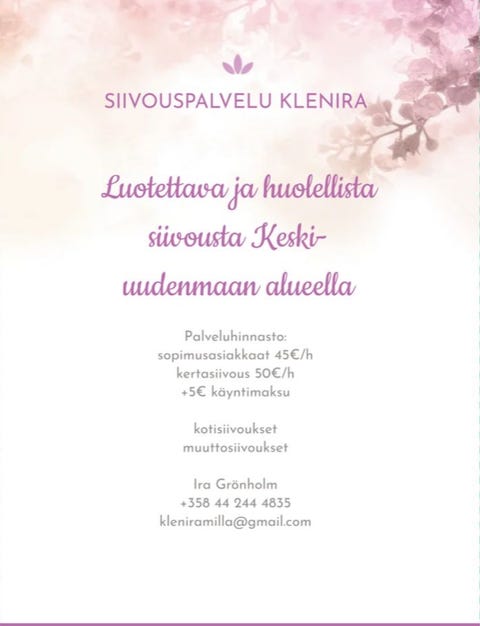 30 €🍂❄️ KEMIX – Kodin, toimiston ja pihan siivouspalvelut Uudellamaalla!Helsinki, Pohjois-Haaga, Uusimaa3 pvAutochemix OYLisää suosikiksi.