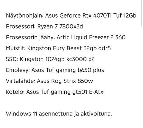 2 000 €Asus Tuf Gaming Pöytätietokone Ryzen 7 7800x3d 32GB 1TB RTX 4070Ti 12GB AsusKouvola, Kankaronmäki-Eskolanmäki, Kymenlaakso5 pvLisää suosikiksi.