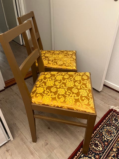 10 €Kaksi puutuolia keltakuvioisella istuinverhoilullaRovaniemi, Sahanperä-Ratantaus, Lappi8.2.Lisää suosikiksi.