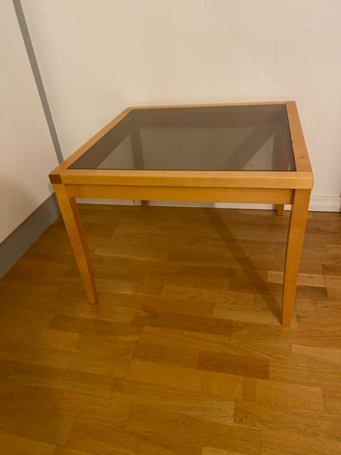 Puinen sohvapöytä, lasikansi