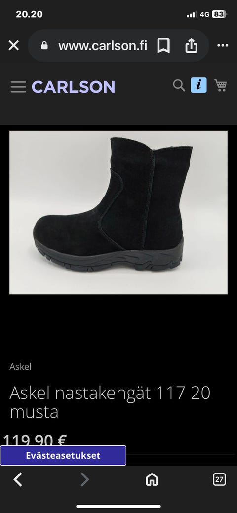 70 €Mustat mokkanahkaiset vettä hylkivät ASKEL merkkiset naisten nastakengät.Koko 39Lahti, Kartano-Paavola, Päijät-Häme7 pvOsta hetiLiikkeessä oleva kuorma-autoToriDiiliLisää suosikiksi.