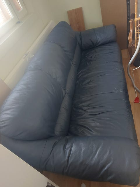 Sininen keinonahkasohva